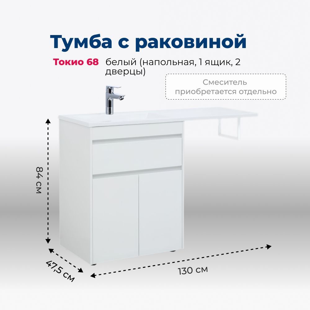 Тумба с раковиной Aquanet Токио 130 (напольная, 1 ящик, 2 дверцы) белого цвета представляет новый формат тумб производства Aquanet. Раковина из литьевого мрамора имеет длинную платформу, которая выходит далеко за пределы тумбы. Она предназначена для того, чтобы установить с правой стороны от тумбы стиральную машину. Платформа имеет такую длину, которая позволит спрятать под нее машинку средних размеров с фронтальной загрузкой. Корпус тумбы выполнен из влагостойкого ЛДСП, а фасады – из МДФ с покрытием эмалью. Разнообразные зоны хранения в тумбе шириной 680 мм скрыты в ящике и за распашными дверками. Тумбу можно использовать и без соседства со стиральной машиной, а свободное пространство под платформой раковины занять подкатной тумбой, приспособлениями для уборки помещения или столиком.
