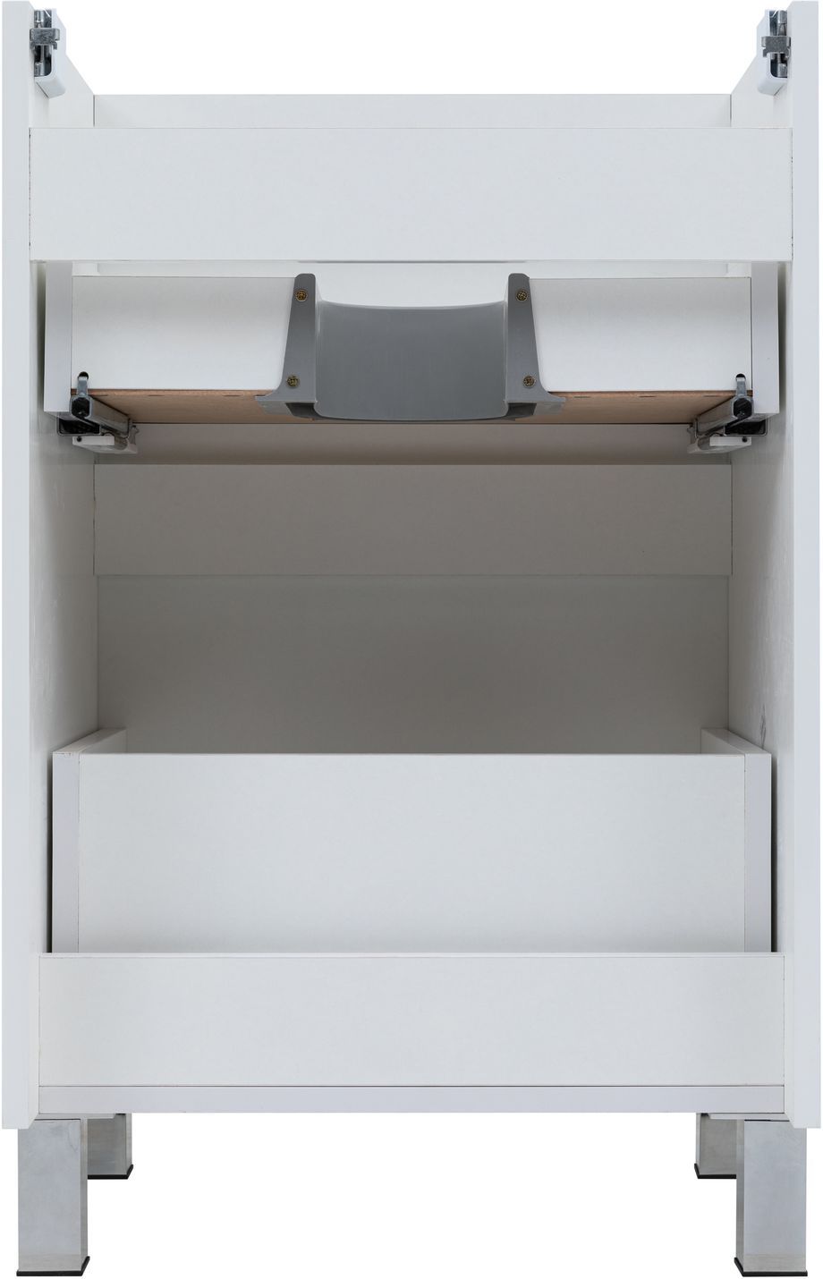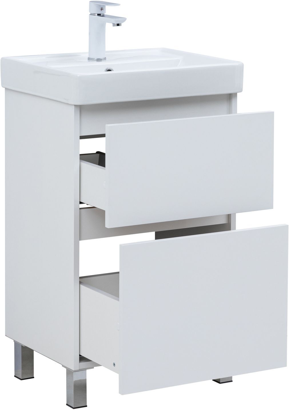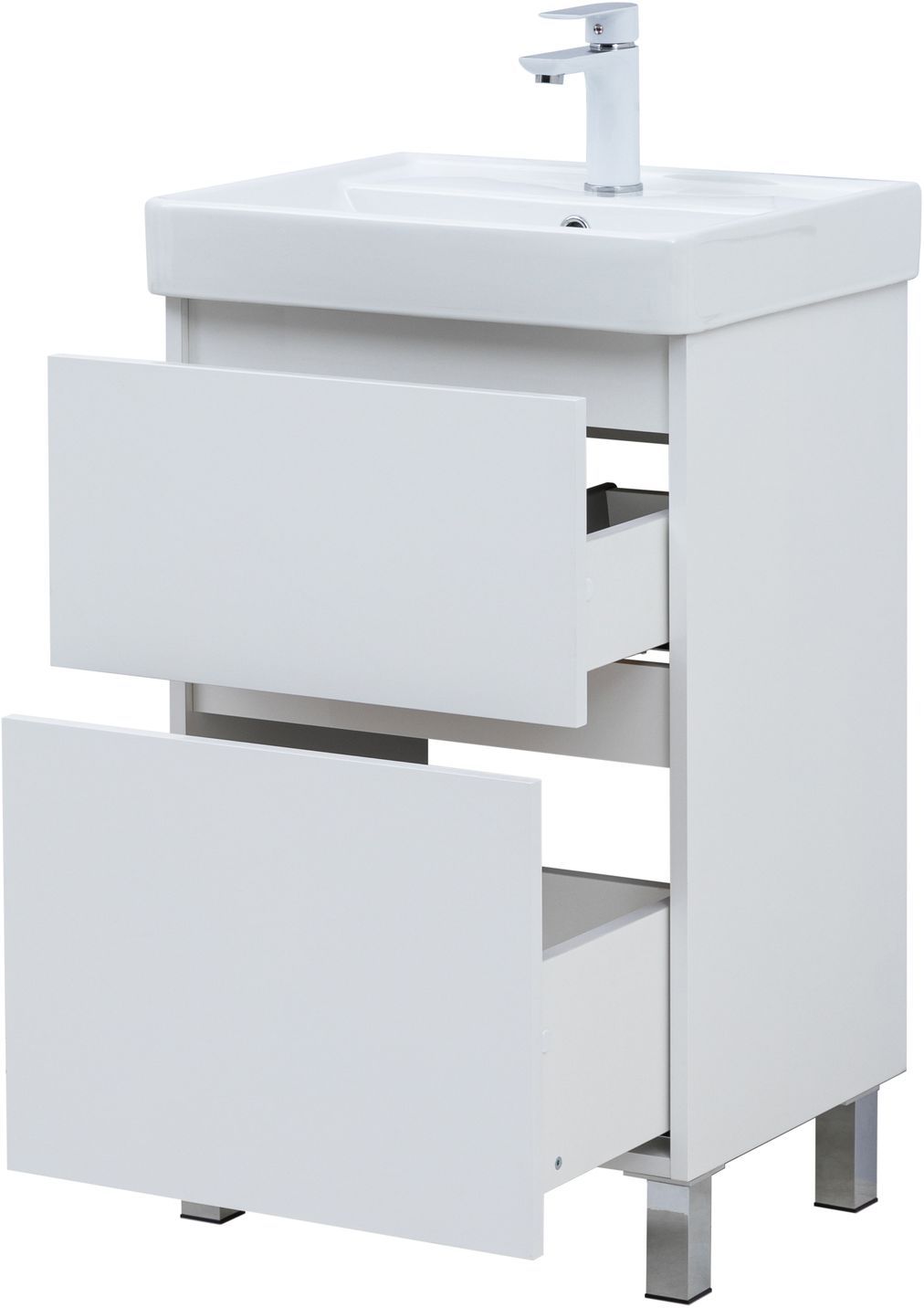 Пластиковое ограждение сифона в сером цвете аккуратно скрывает коммуникации. Прочное дно нижнего ящика, изготовленное из влагостойкой ЛДСП толщиной 16 мм, позволяет хранить даже тяжелые предметы. Предусмотренное место за нижним ящиком для подводки коммуникаций снизу упрощает монтаж и подключение сантехники. Aquanet Вега 50 – это оптимальное решение для создания стильного и практичного интерьера ванной комнаты.