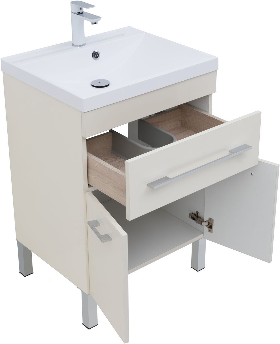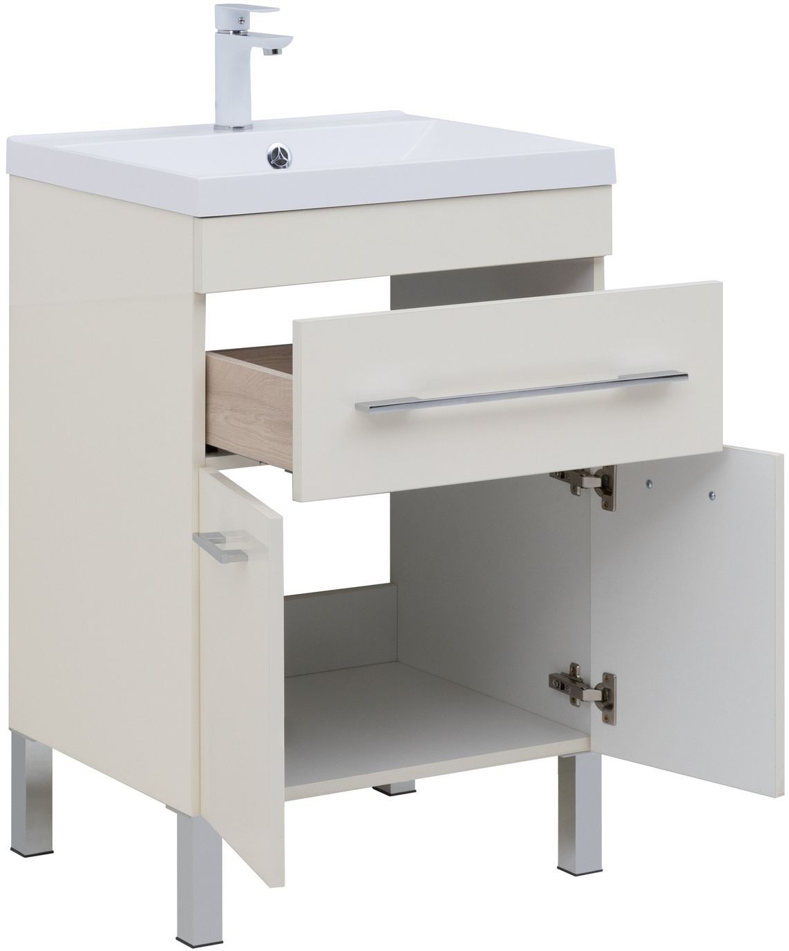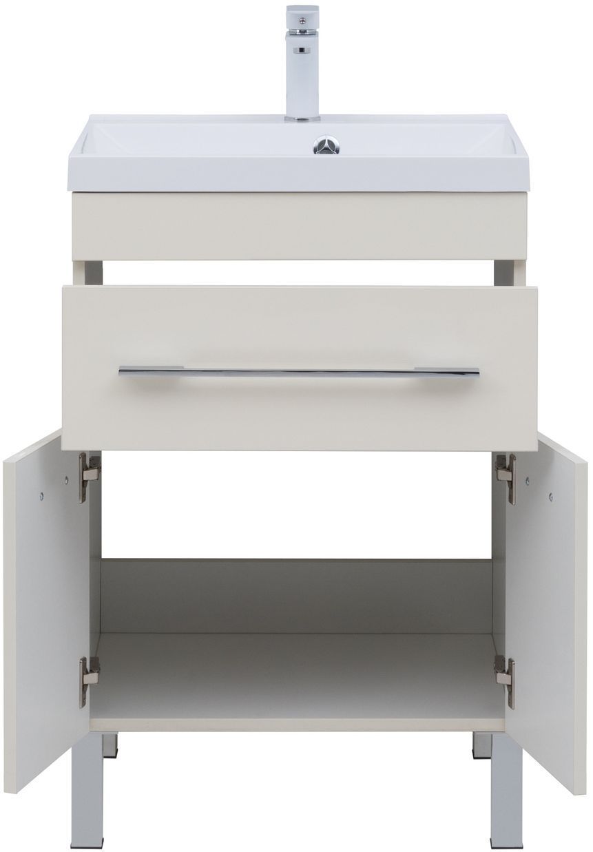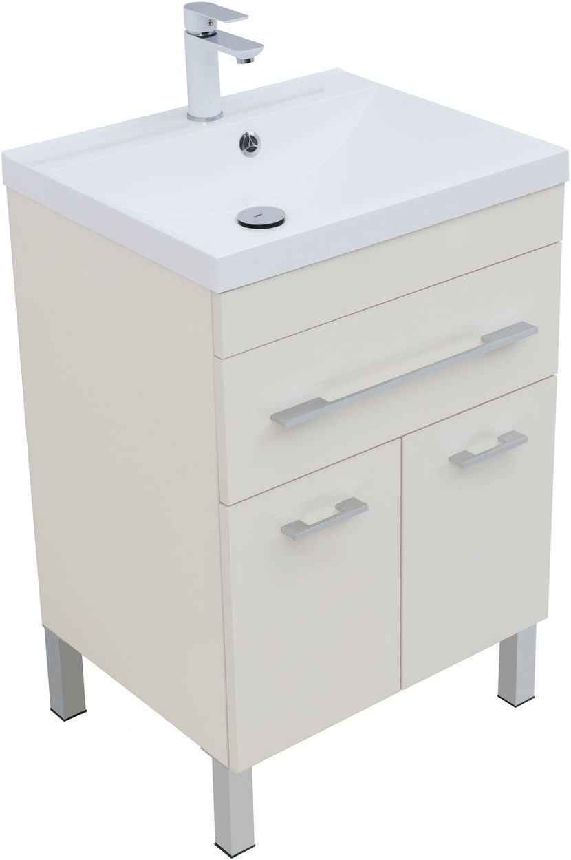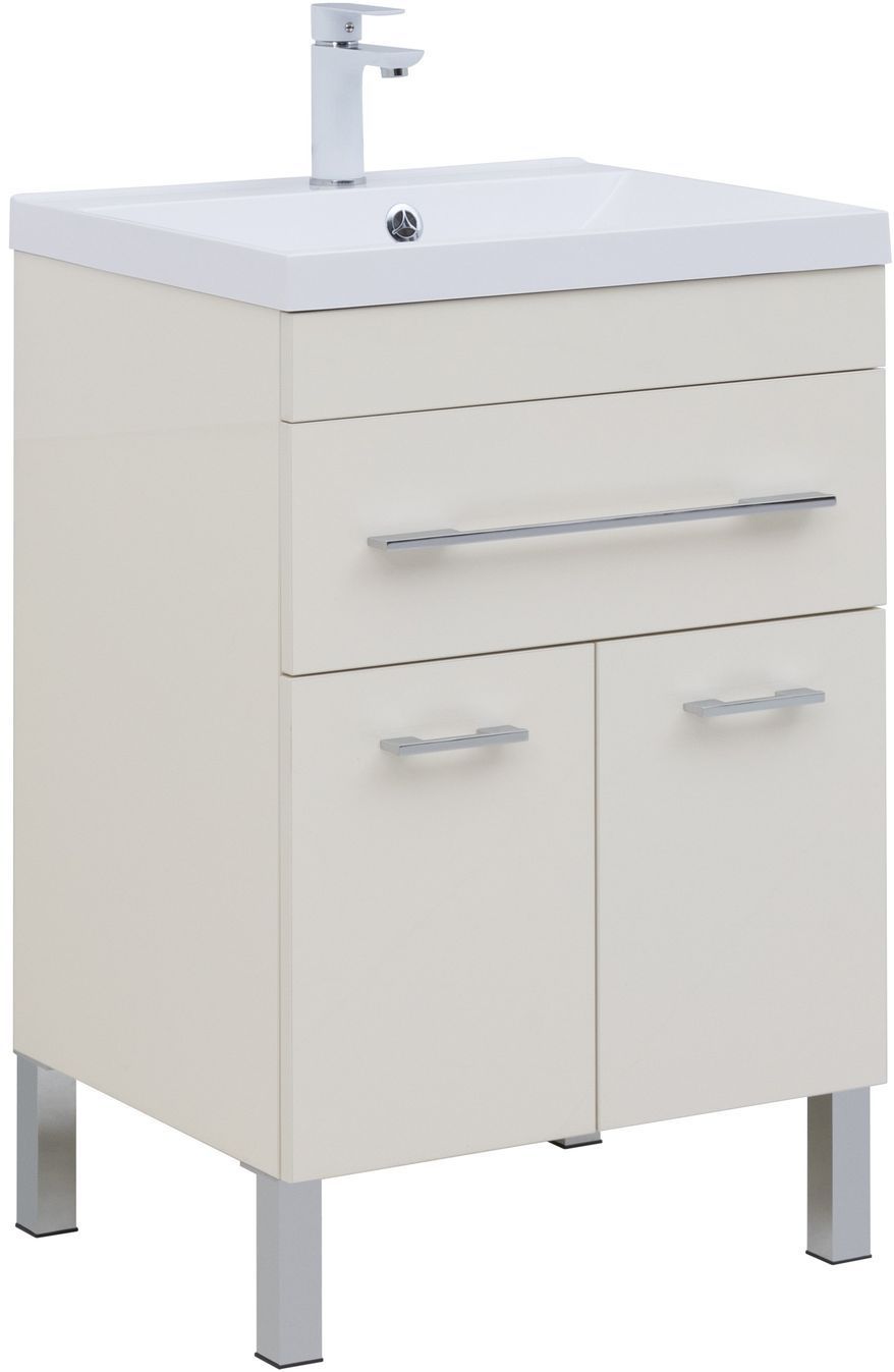 Тумба с раковиной Aquanet «Верона» 60 оснащена глянцевой поверхностью, окрашенной в цвет «крем». Модель позволяет хранить гигиенические средства, косметику. Для этого используется один выдвижной ящик и полка, скрытая за двумя распашными дверцами. Легкость открывания обеспечивают горизонтальные серебристые ручки, закрывания — механизм доводчика. Корпус сделан из влагостойкого ЛДСП, фасад — из МДФ. Модель напольная, оборудована четырьмя устойчивыми ножками. Габариты — 570х474х832 мм.