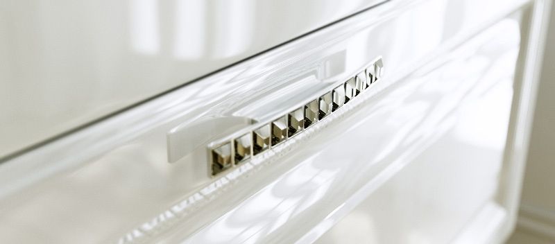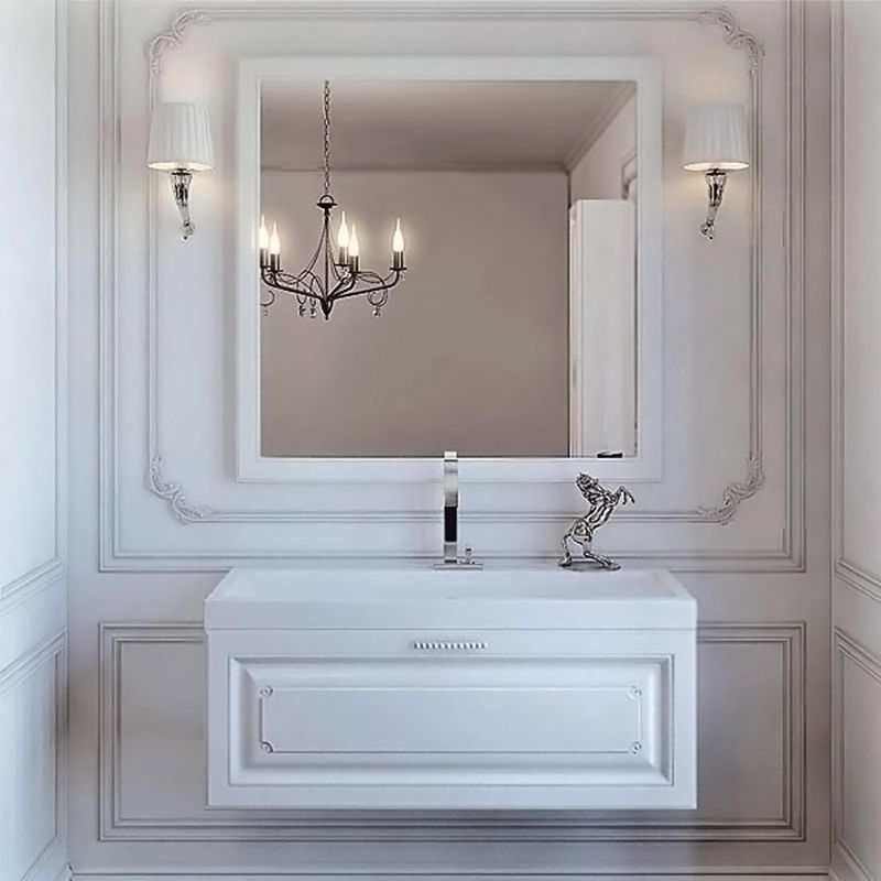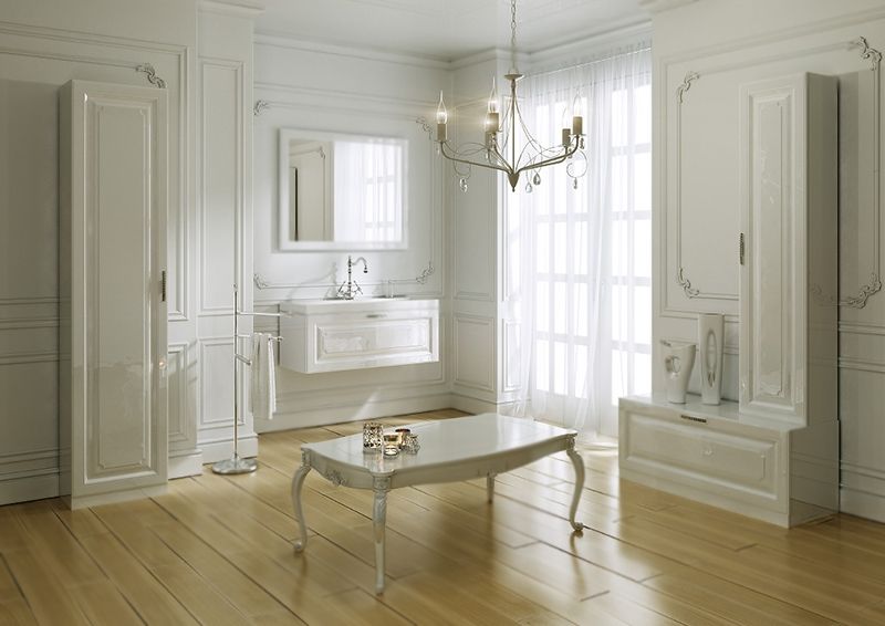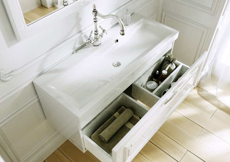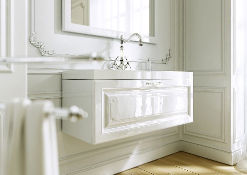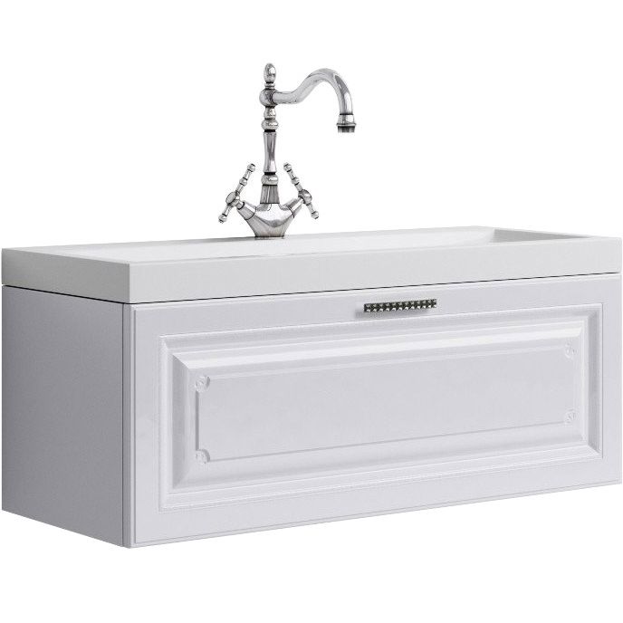 Подвесная тумба под раковину Aqwella 5 Stars Империя 100 Emp.01.10/W белая, с глянцевой поверхностью, с фрезеровкой, с хромированной ручкой, инкрустированной кристаллами Swarovski, с выдвижным ящиком. Для использования в ванных комнатах с повышенной влажностью.