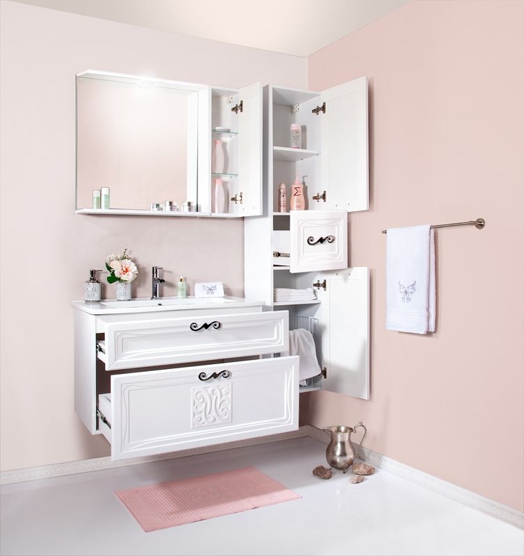 Тумба под раковину Бриклаер Адель 85 с двумя выдвижными ящиками выполнена в стилистике прованс с плавными изгибами декора, подчеркнутыми нарочито прямоугольными формами корпуса. Фасад украшен замысловатым узором. Тумба предназначена для использования в помещениях с повышенной влажностью, хорошо впишется в интерьер любой ванной комнаты, подчеркнув его изящность.