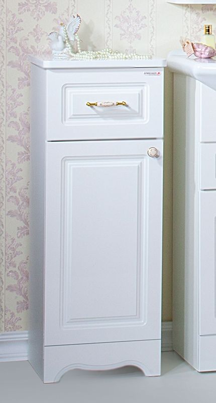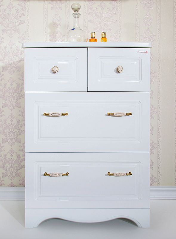 - Напольная тумба под раковину Бриклаер Анна 120 с двумя распашными дверцами и с восемью выдвижными ящиками. Для использования в ванных комнатах с повышенной влажностью.