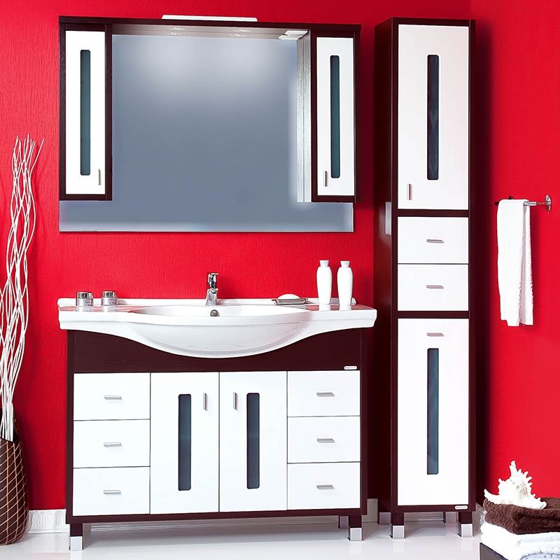 Тумба под раковину Бриклаер Бали 120 на ножках, с двумя распашными дверцами по центру с витражными вставками из матового стекла и одной полкой за ними, с шестью выдвижными ящиками. Изящная хромированная фурнитура со специальным покрытием от царапин. Корпус выполнен из ЛДСП в декоре, а фасад – из МДФ с трехслойным покрытием белой глянцевой эмалью. Тумба проявляет устойчивость к влажному воздуху и длительное время сохраняет свой первоначальный внешний вид.