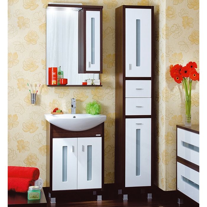 Тумба под раковину Бриклаер Бали 60 на ножках, с двумя распашными дверцами, с витражными вставками из матового стекла. Корпус выполнен из ЛДСП в декоре, а фасад – из МДФ с трехслойным покрытием белой глянцевой эмалью. Тумба проявляет устойчивость к влажному воздуху и длительное время сохраняет свой первоначальный внешний вид.
