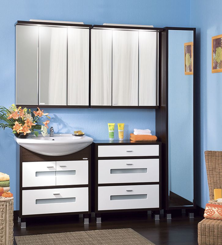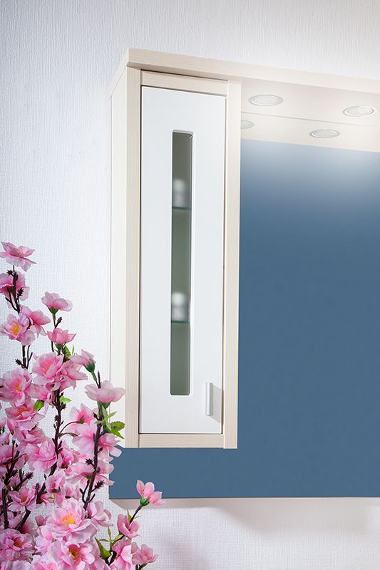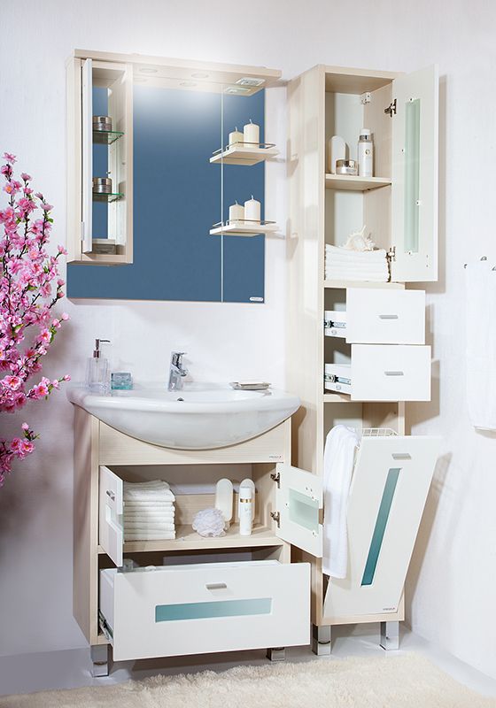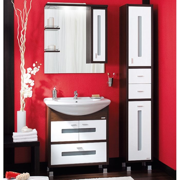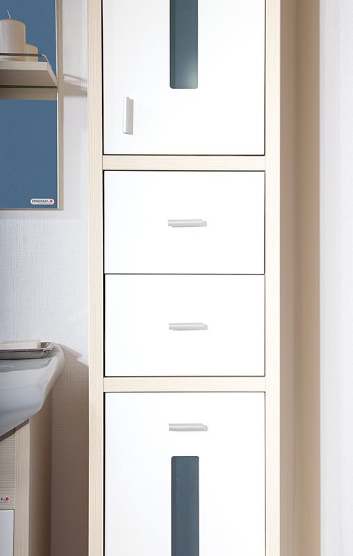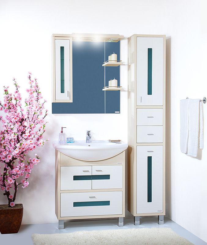 Тумба под раковину Бриклаер Бали 75 с двумя распашными дверцами сверху и одним выдвижным ящиком снизу, с витражными вставками из матового стекла. Корпус выполнен из ЛДСП в декоре, а фасад – из МДФ с трехслойным покрытием белой глянцевой эмалью. Тумба проявляет устойчивость к влажному воздуху и длительное время сохраняет свой первоначальный внешний вид.