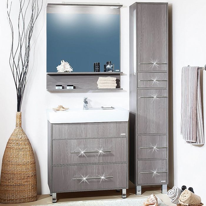 Тумба под раковину Бриклаер Чили 80 на ножках, с двумя выдвижными ящиками, с вытянутыми хромированными ручками. Выполнена в стиле минимализм. Корпус и фасад выполнены из ЛДСП с декором под цвет экзотических деревьев в оттенках серого. Тумба проявляет устойчивость к влажному воздуху и длительное время сохраняет свой первоначальный внешний вид.