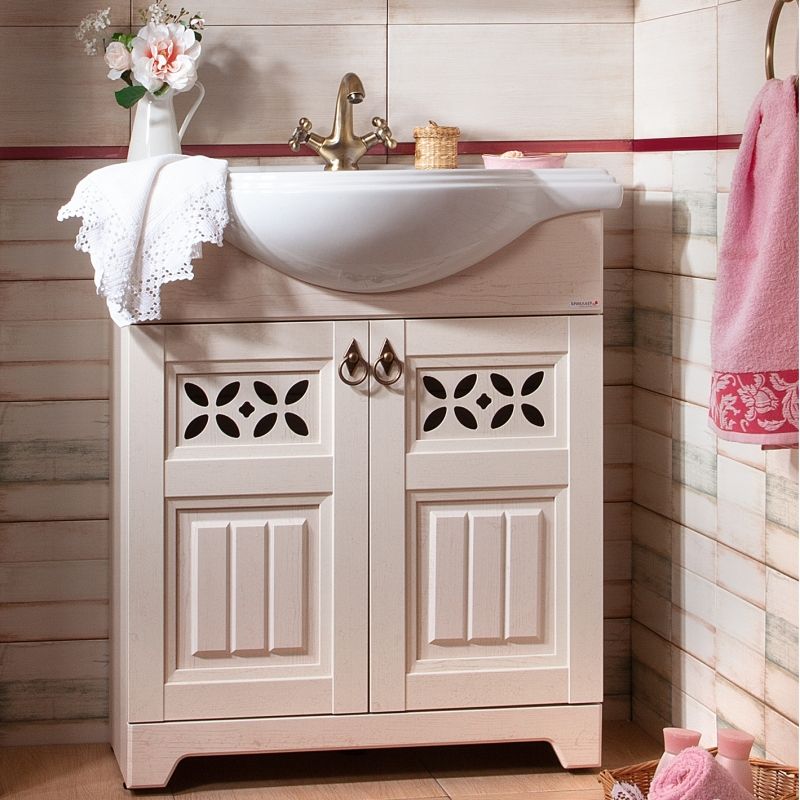 Тумба под раковину Бриклаер Кантри 80 с двумя распашными дверцами сочетает в себе элегантность и практичность. Филенчатый фасад украшен прорезями. Тумба предназначена для использования в помещениях с повышенной влажностью и отлично впишется в интерьер любой ванной комнаты.