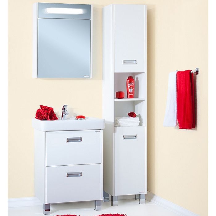 Белоснежная тумба под раковину Бриклаер Палермо 60 на ножках, с двумя распашными дверцами сверху и с одним выдвижным ящиком снизу, дарит ощущение свежести, чистоты и уюта. Корпус выполнен из белого ЛДСП, фасад из белого ЛДСП, покрытого глянцевым лаком, ручки из металла, ножки из пластика. Тумба проявляет устойчивость к влажному воздуху и длительное время сохраняет свой первоначальный внешний вид.