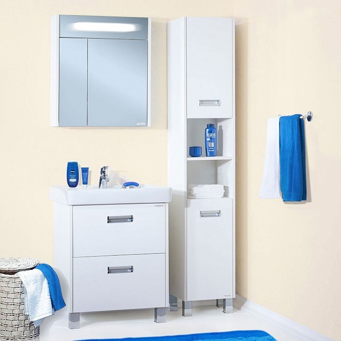 Белоснежная тумба под раковину Бриклаер Палермо 70 на ножках, с двумя распашными дверцами сверху и с одним выдвижным ящиком снизу, дарит ощущение свежести, чистоты и уюта. Корпус выполнен из белого ЛДСП, фасад из белого ЛДСП, покрытого глянцевым лаком, ручки из металла, ножки из пластика. Тумба проявляет устойчивость к влажному воздуху и длительное время сохраняет свой первоначальный внешний вид.