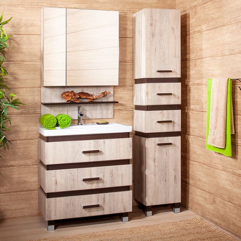 Тумба под раковину на ножках Бриклаер Техас 70 с тремя выдвижными ящиками. Предназначена для использования в ванных комнатах с повышенной влажностью. Цвет теплого натурального дерева удачно контрастирует с отделкой цвета венге и создает ощущение солнечного света и тепла. Влагостойкие материалы нового поколения. Соответствие европейским стандартам качества и экологической безопасности.