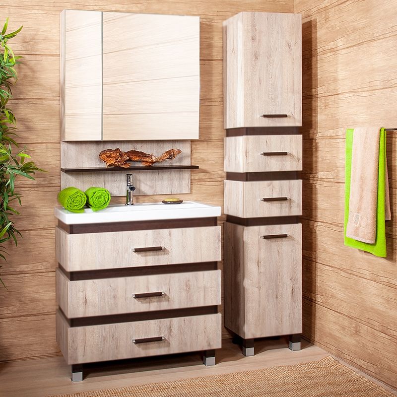 Тумба под раковину на ножках Бриклаер Техас 80 с тремя выдвижными ящиками. Предназначена для использования в ванных комнатах с повышенной влажностью. Цвет теплого натурального дерева удачно контрастирует с отделкой цвета венге и создает ощущение солнечного света и тепла. Влагостойкие материалы нового поколения. Соответствие европейским стандартам качества и экологической безопасности.