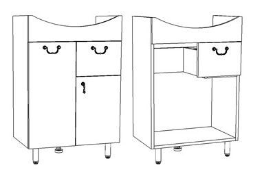 У тумбы 2 дверцы, 1 выдвижной ящик. На дверях петли с доводчиками. Высота ящиков 110 мм. У тумбы 3 опоры.