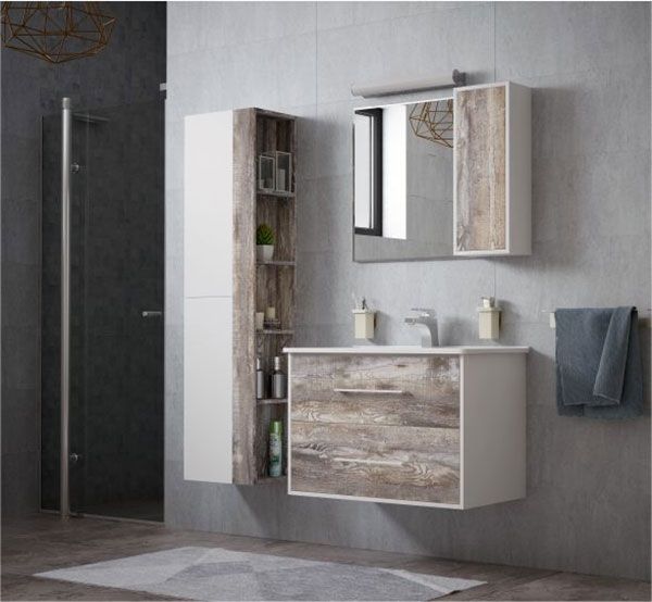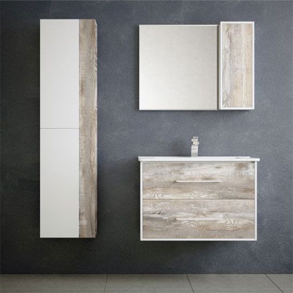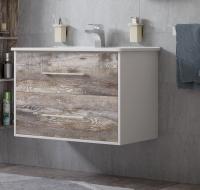 Подвесная тумба оснащена двумя выдвижными ящиками. Верхний ящик высотой 70 мм с выпилом под коммуникации, нижний - высотой 160 мм. Для крепления к стене используются подвесы "Scarpi". Боковины и низ тумбы в белой глянцевой эмали. Фасады выполнены из текстурных материалов. Ручки - по центру фасадов.