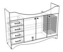 Тумба оснащена четырьмя выдвижными ящиками слева, две дверцы посередине, позади полка, справа - корзина для белья. Фасады - с фрезеровкой.