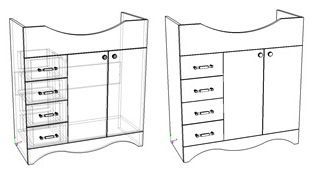 Тумба оснащена четырьмя выдвижными ящиками слева и двумя дверцами. Фасады - с фрезеровкой.
