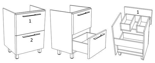 У тумбы 2 выдвижных ящика. Высота внутри ящиков 160 мм. Верхний ящик разделен на 2 части.