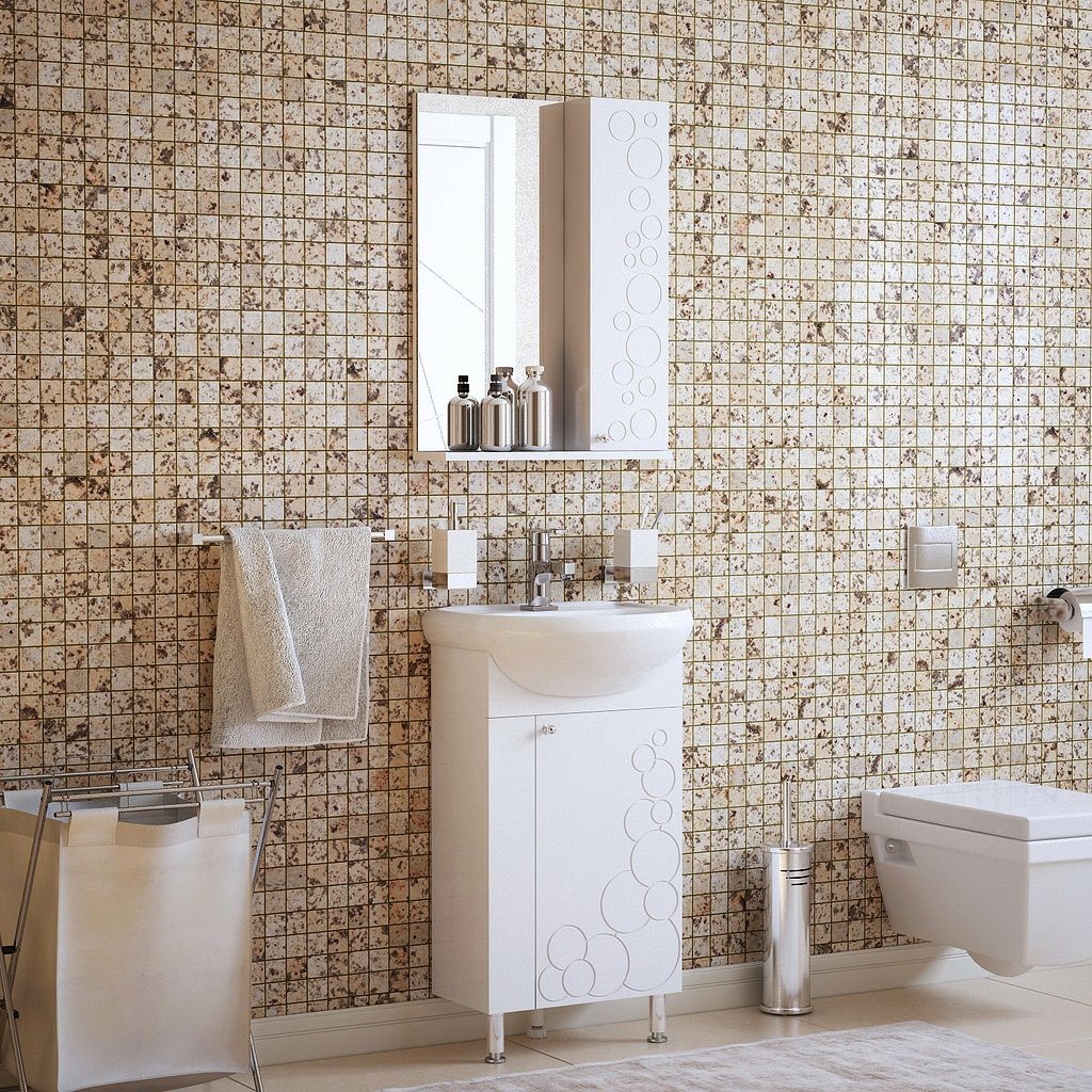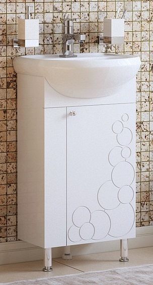 Тумба оснащена 1 дверцей, позади 1 полочка. Спереди неподвижная планка. На двери петли с доводчиками. У тумбы 2 металлические опоры, 1 пластиковая. Коромысло и фасад - МДФ в плёнке. Корпус - ЛДСП. Фрезеровка в виде пузырьков.