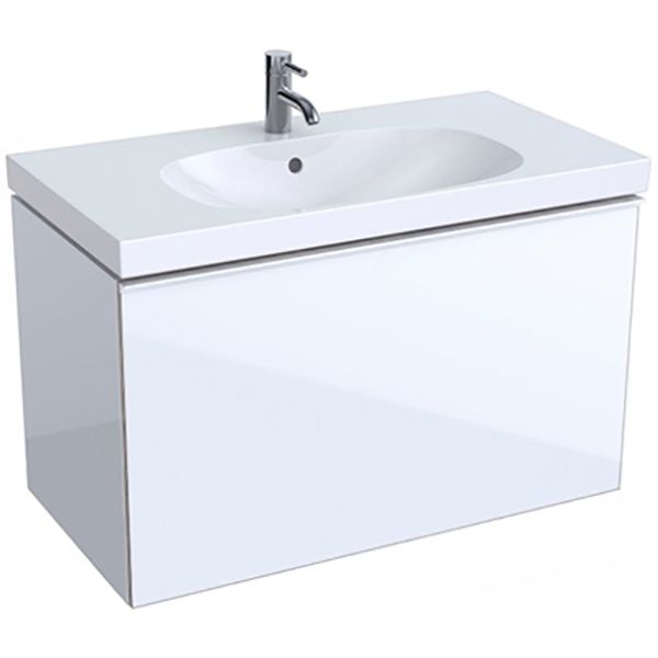 Тумба под раковину Geberit (Keramag) Acanto 500.612.01.2 подвесная, прямоугольная в современном стиле в цвете белый глянец. Передняя часть дверцы выполнена из стекла. Имеет один внутренний выдвижной ящик. Для использования в ванных комнатах с повышенной влажностью.