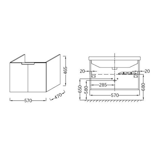 - Габариты корпуса тумбы (ШхВхД): 57x47x46,1 см.
