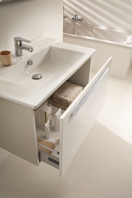 Подвесная тумба под раковину Jacob Delafon Struktura 77 EB1285-E13 с 1 выдвижным ящиком выполнена в строгом стиле с прямыми линиями и углами. Она сочетает в себе лаконичный дизайн и продуманную функциональность. Мебель этой серии отлично впишется в интерьер ванной комнаты в современном или хай-тек стиле.