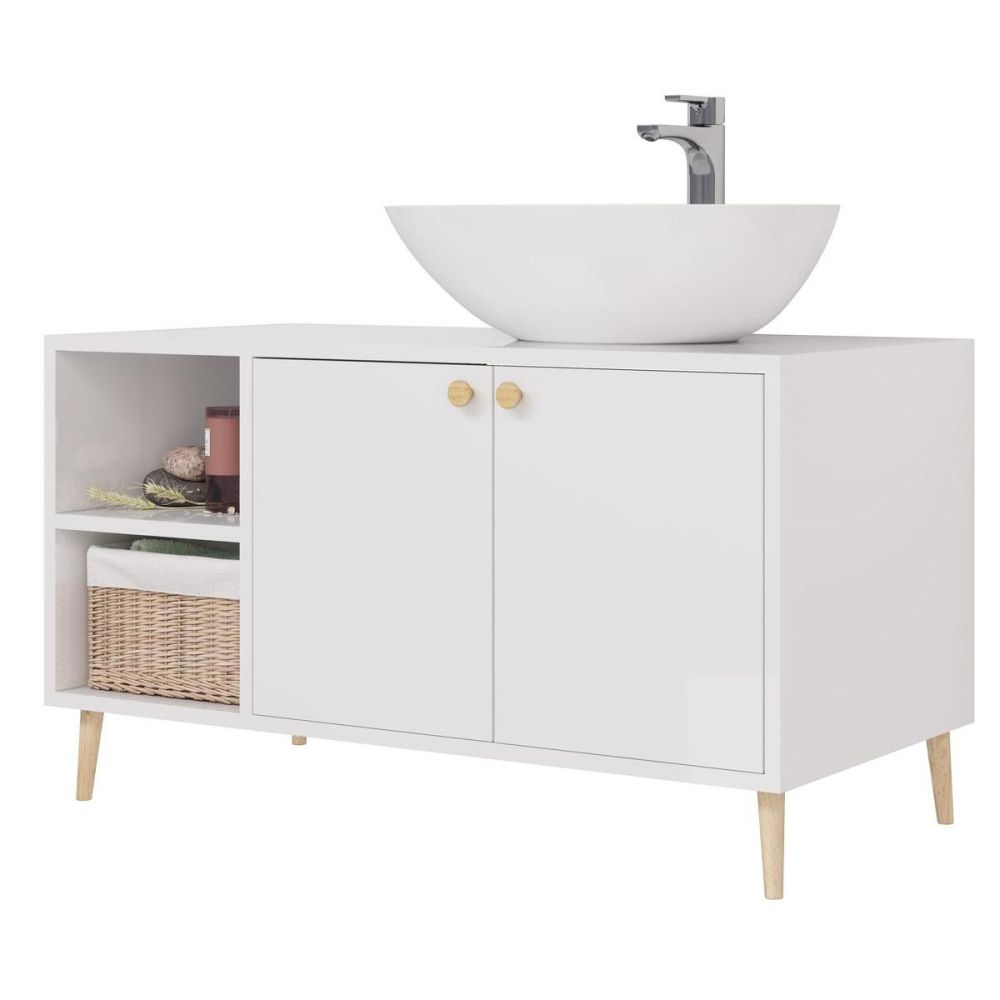 Тумба под раковину напольная Dreja Luno 100 см, белый. Фурнитура: Boyard. Компоновка: 2 дверцы, 2 открытые полки. Монтаж: напольный.