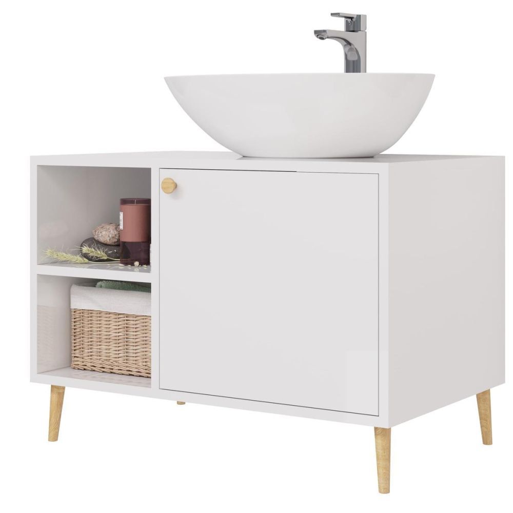 Тумба под раковину напольная Dreja Luno 80 см, белый. Фурнитура: Boyard. Компоновка: 1 дверца, 2 открытые полки. Монтаж: напольный.