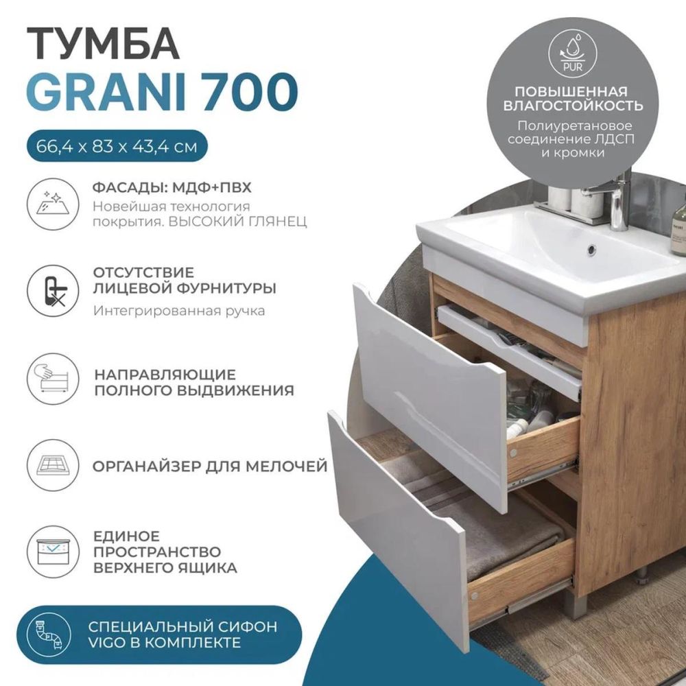 Тумба под раковину напольная VIGO Grani 202 дуб золотой, 70 см. Гарантийный срок 2 года. Монтаж: напольный. Доводчик: нет. Нажимной механизм: нет.