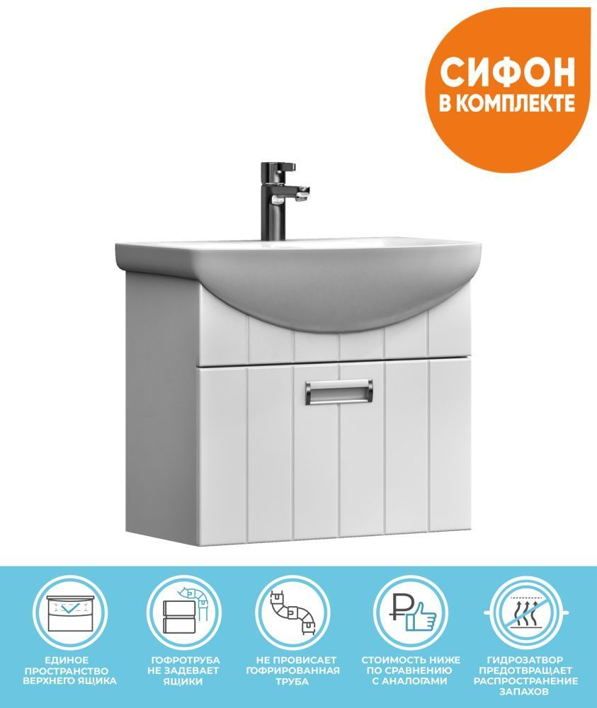 Тумба подвесная, 1 вестительный выдвижной ящик; ручка врезная металлическая хромированная. Специальный сифон Vigo в комплекте. Материал корпуса: влагостойкая ЛДСП Материал фасадов: ЛМДФ Покрытие: пленка ПВХ Ящики: направляющие полного выдвижения.