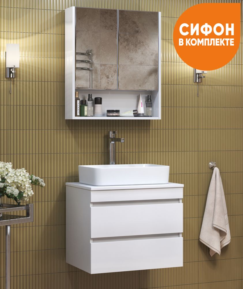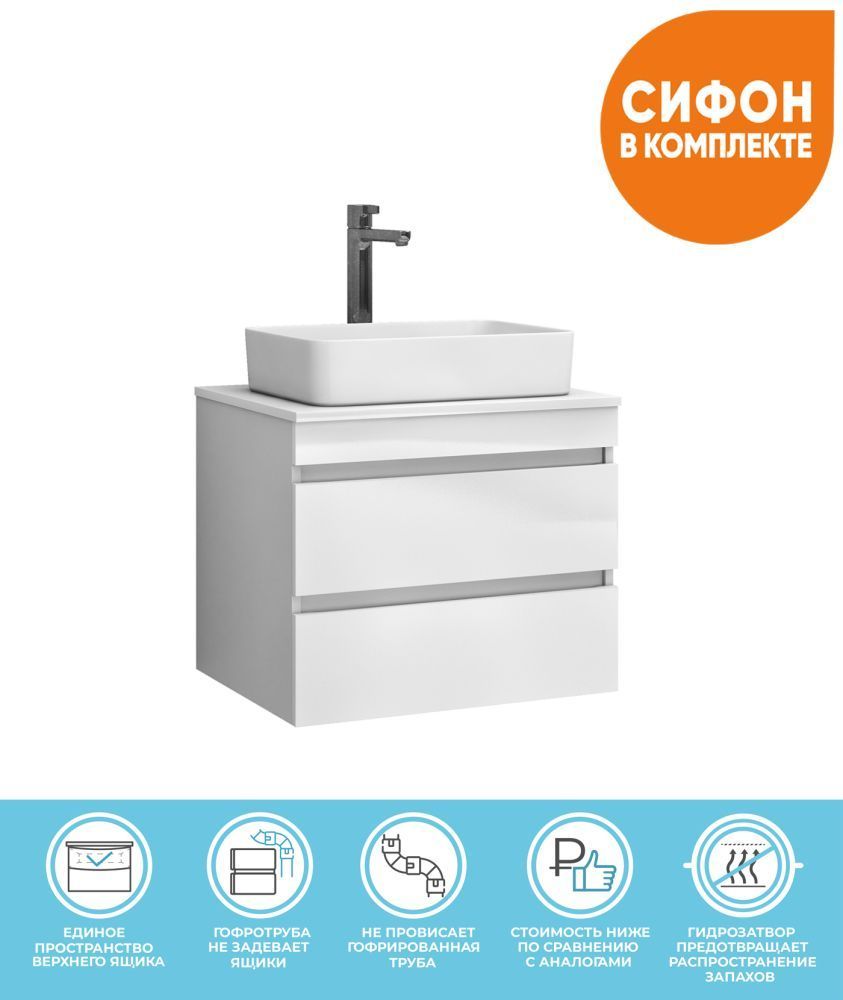2 ящика. Специальный сифон Vigo в комплекте. Материал корпуса: влагостойкая ЛДСП Материал фасада: ЛМДФ Покрытие фасада: пленка ПВХ Ящики: направляющие полного выдвижения Отсутствие лицевой фурнитуры – интегрированная в фасад ручка