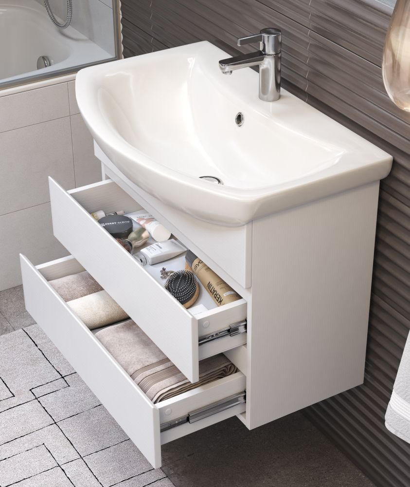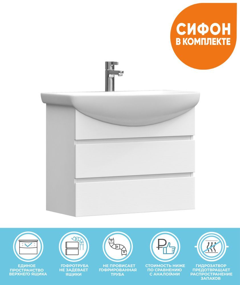 2 ящика. Специальный сифон Vigo в комплекте. Материал корпуса и фасада: влагостойкая ЛДСП Ящики: направляющие полного выдвижения Отсутствие лицевой фурнитуры – интегрированная в фасад ручка