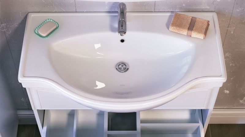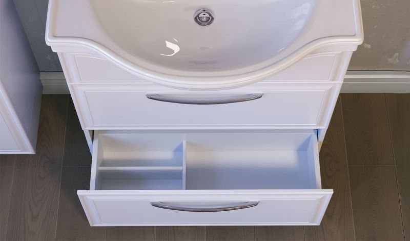 Тумба под раковину Raval Classic 80 Cla.01.80/N/W с двумя выдвижными ящиками, с двумя ножками. Предназначена для использования в ванных комнатах с повышенной влажностью. Ящики оснащены доводчиками с функцией плавного закрывания и разделителями для организации системы хранения. Влагостойкие и экологичные материалы, качественная работа фурнитуры, ударопрочность, приятные тактильные ощущения.