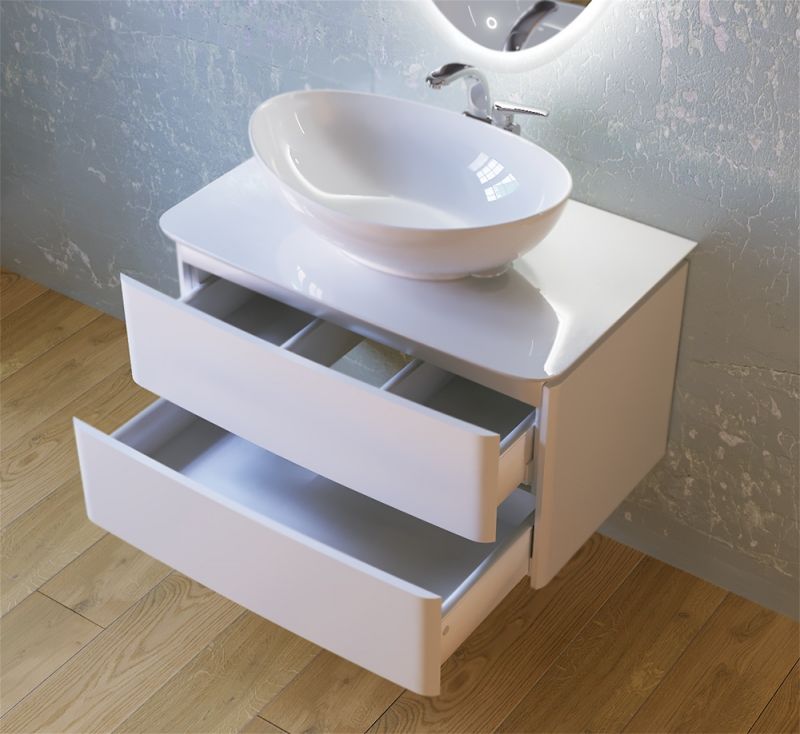 Подвесная тумба под раковину Raval Moon 75 Moo.01.75/P/W с двумя выдвижными ящиками оснащенными доводчиками с функцией плавного закрывания. Предназначена для использования в ванных комнатах с повышенной влажностью. Влагостойкие и экологичные материалы, качественная работа фурнитуры, ударопрочность, приятные тактильные ощущения.