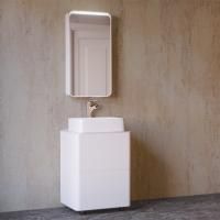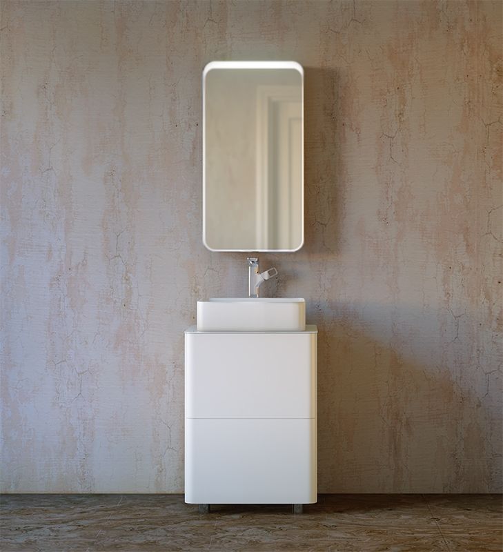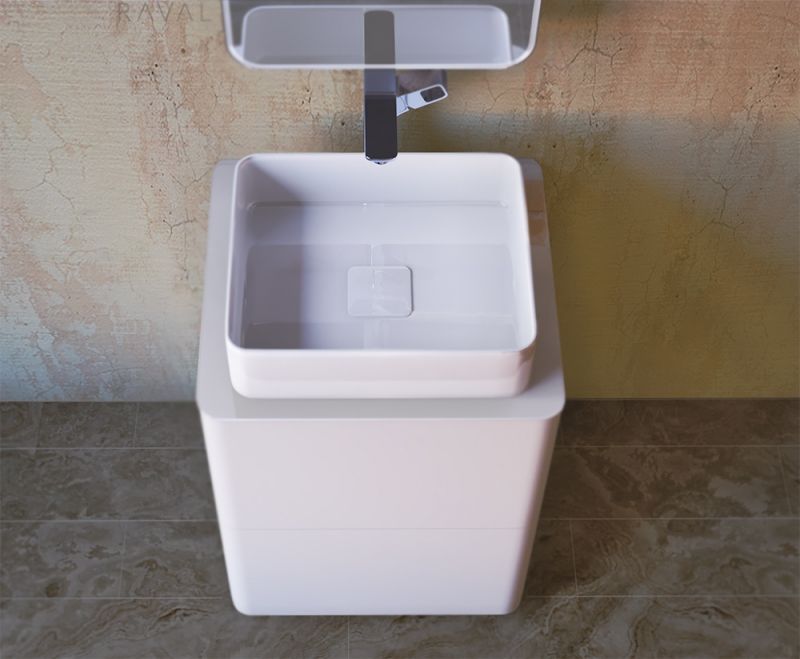 Тумба под раковину на ножках Raval Pure 56 Pur.01.56/N/W с гладкими формами, с двумя выдвижными ящиками со скрытым механизмом открывания Push to Open фирмы Hettich, со столешницей из стекла фирмы Lacobel. Предназначена для использования в ванных комнатах с повышенной влажностью. Влагостойкие и экологичные материалы, качественная работа фурнитуры, ударопрочность, приятные тактильные ощущения.
