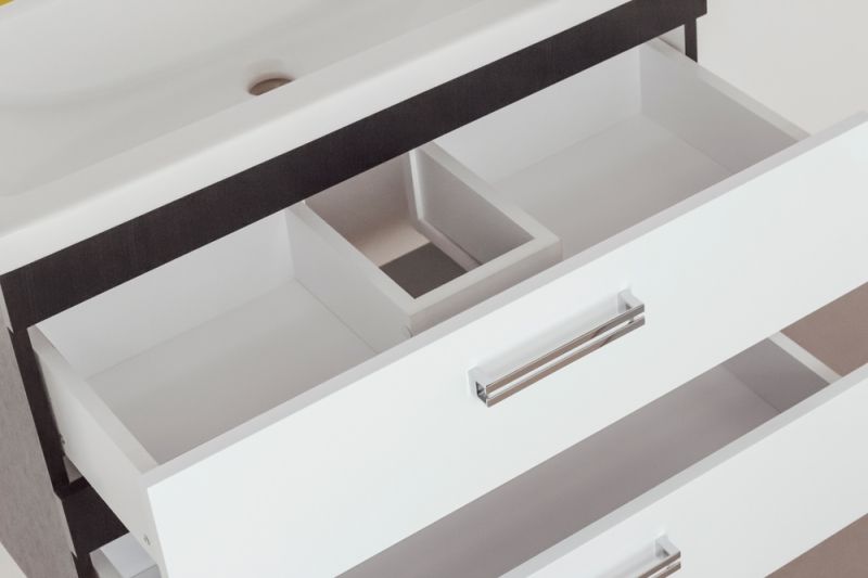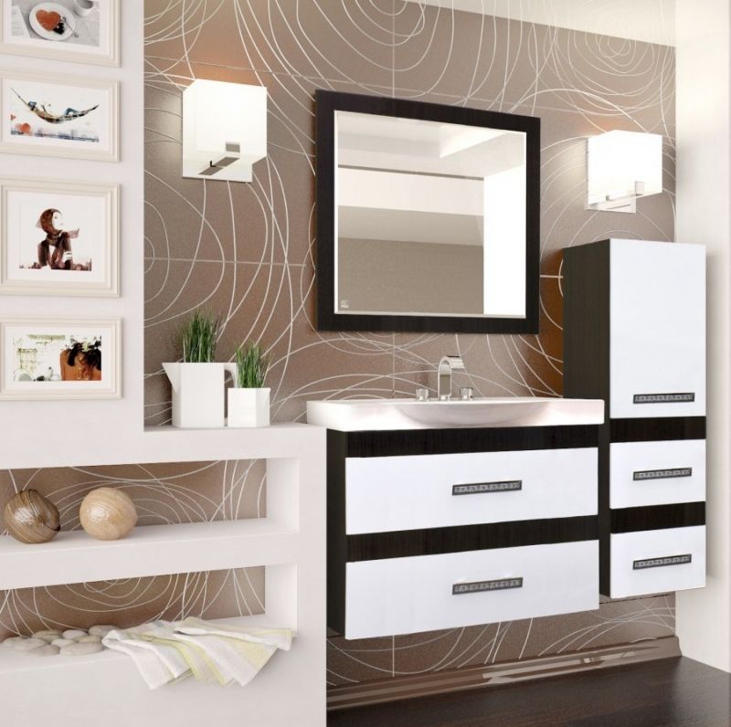 Дизайн: современный, лаконичное исполнение, стильное сочетание 2х цветов, акцент на хромированных ручках, которые подчеркивают строгие формы мебели.