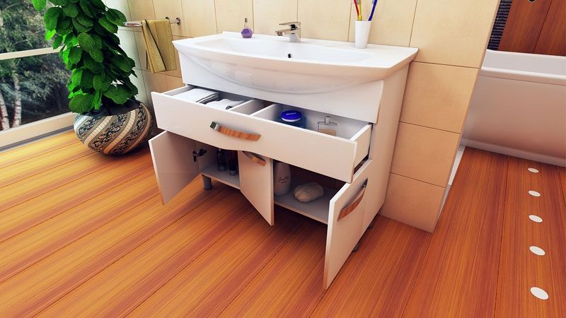 Лаконичная форма и удобная система хранения позволит с комфортом использовать тумбу в Вашей ванной комнате. Идеально подходит для интерьера в современном стиле.