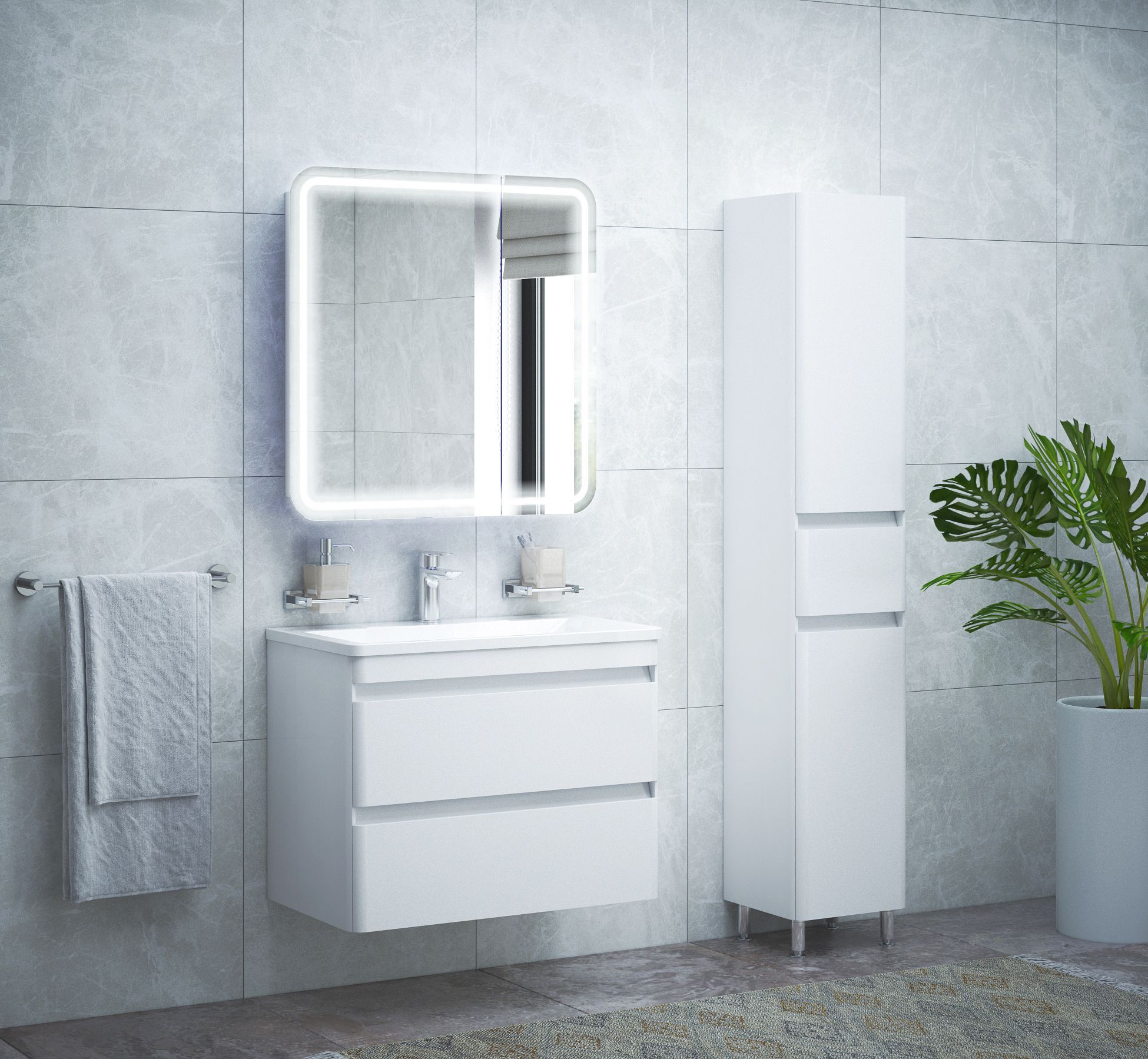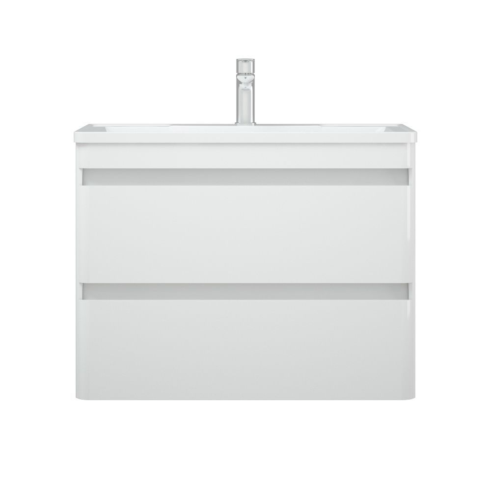 Подвесная тумба имеет интересный эргономичный дизайн - скругление боковин плавно переходит в скругления на фасадах. У тумбы 2 выдвижных ящика на направляющих скрытого монтажа с доводчиками. Нижний ящик цельный, верхний разделен на 2 отделения, с местом под коммуникации посередине. Верхний ящик высотой 100 мм с выпилом под коммуникации, нижний высотой 170 мм. Коромысло, боковины, фасады - МДФ в плёнке. Фасады не имеют ручек, конструктив тумбы позволяет открывать фасады без использования ручек.