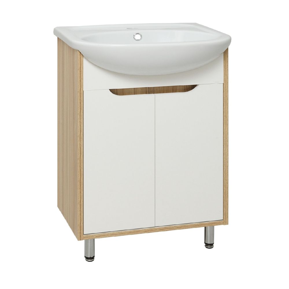 Тумба под умывальник напольная с двумя распашными фасадами и одной внутренней полкой. Ножки хром - 2шт, ножки пластик -2шт.