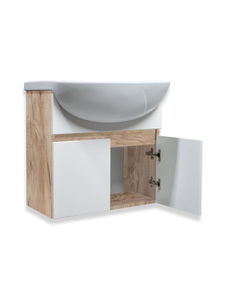 Тумба под раковину для ванной RUNO ЛАДА - модное и оригинальное решение для бюджетного оснащения ванной комнаты. Коллекция мебели ЛАДА выполнена в трёх цветах - классическом белом, в стильных и модных цветах - графит и крафтовый дуб . Тумба под раковину оснащена двумя распашными дверцами, каждая дверца укомплектована двумя петлями, верхняя с доводчиком, нижняя без доводчика. К тумбе подходит керамическая раковина "Уют" (500*420 мм). Раковина глубиной 18 см. Мебель для ванной RUNO - красота и практичность в мелочах!