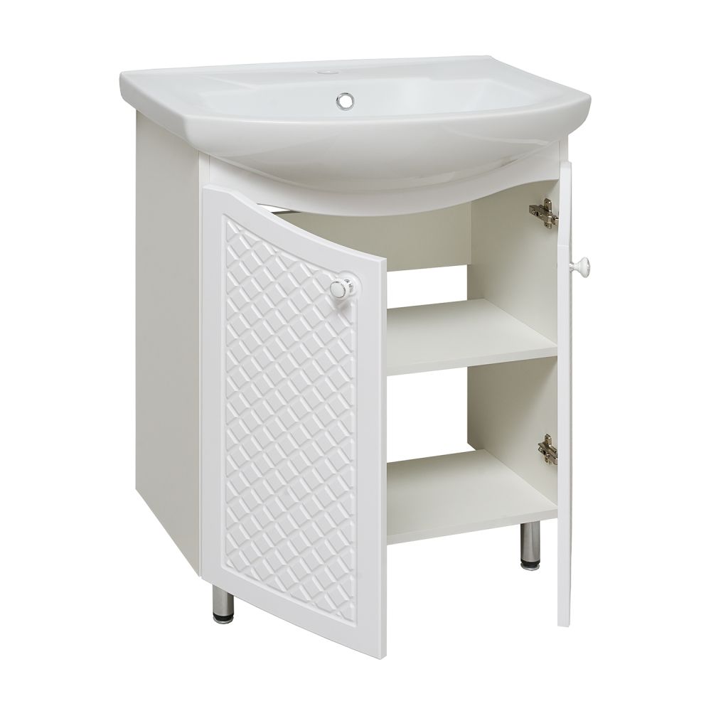 Тумба под умывальник на ножках с тремя распашными дверками и двумя боковыми выдвижными ящиками. За центральной дверкой -одна внутренняя полка. Петли со встроенным доводчиком, ящики на шариковых направляющих полного выдвижения, ручки - 5шт, ножки хром - 2шт, ножки пластик -2шт.