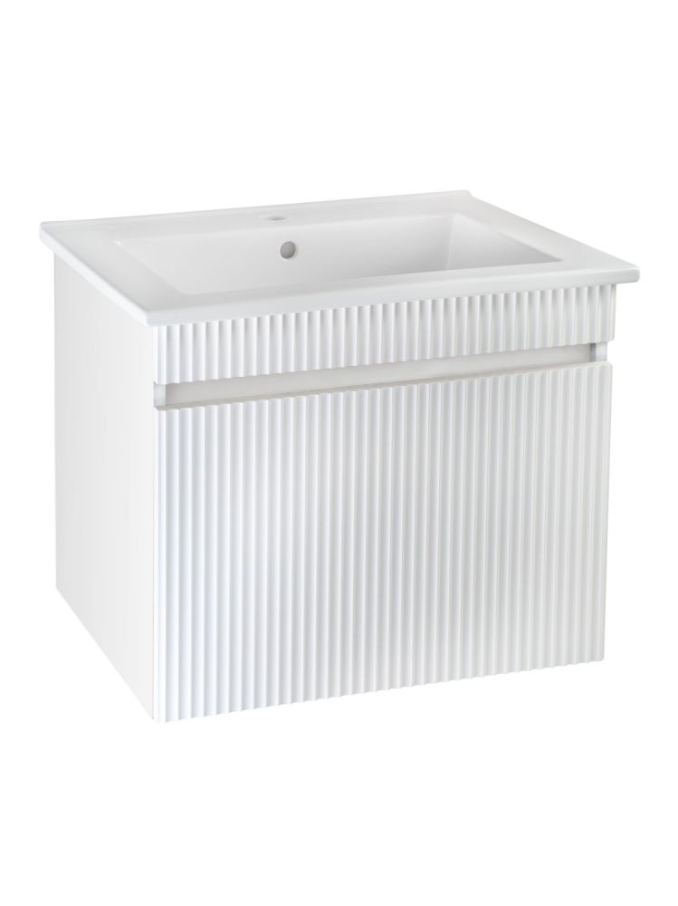 Тумба под раковину МОДЕНА (подвесная) – это изысканность и утончённая роскошь в интерьере. Волнистые рифленые фасады визуально «оживляют» и «приводят в движение» всю обстановку комнаты, сохраняя при этом умиротворение и покой, превосходно сочетаются с классическим белым цветом корпуса. Цвет фасада также классический – белый глянец, идеально впишется в любой интерьер ванной комнаты. Тумба для ванной оснащена выдвижным ящиком на шариковых направляющих, к тумбе для ванной подходит накладная керамическая раковина «Оскар» (770х470 мм). Раковина глубиной 19 см. Мебель для ванной RUNO - красота и практичность в мелочах, тумба под раковину для ванной комнаты Модена – лучший выбор для Вашей ванной комнаты!
