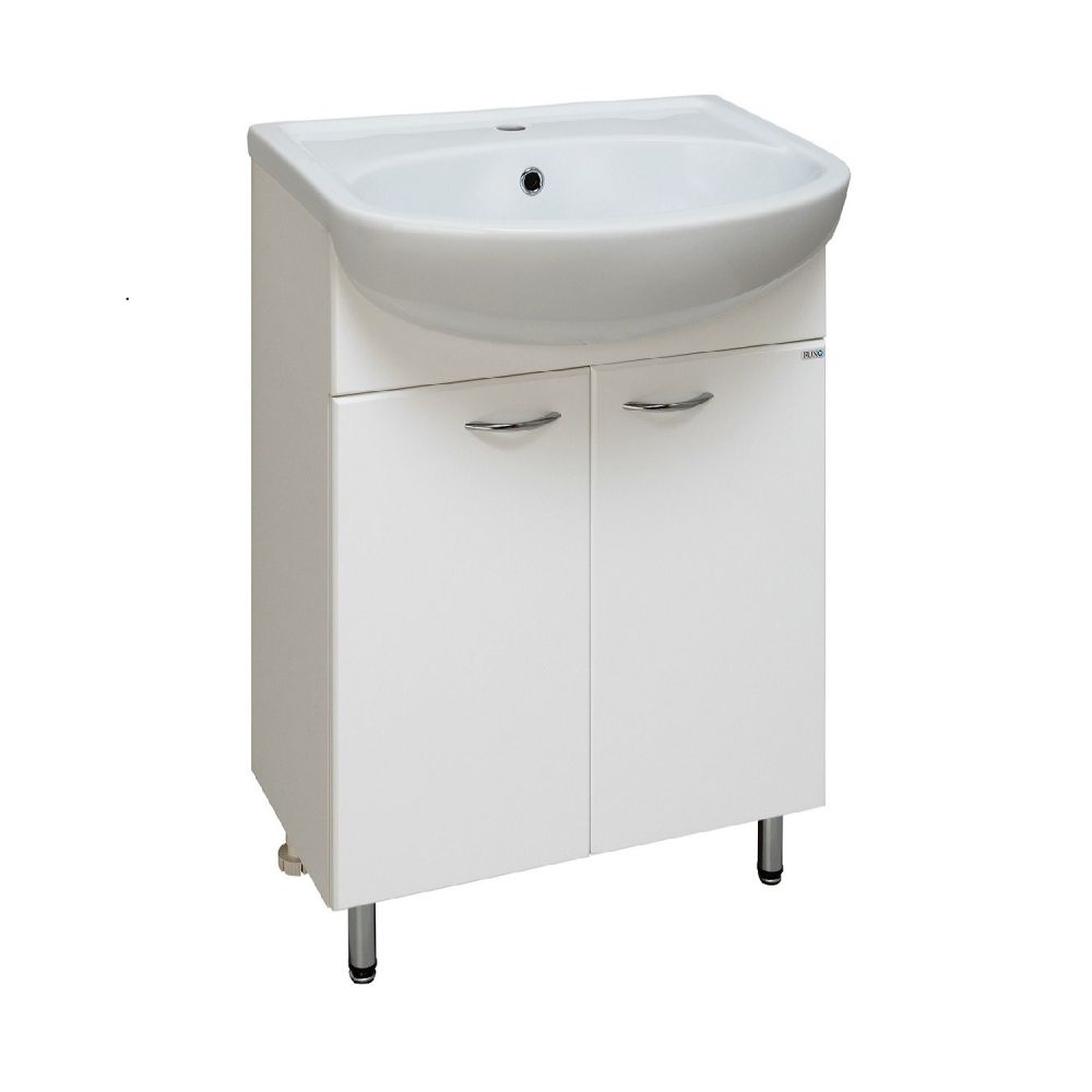 Тумба под умывальник напольная с двумя распашными фасадами и одной внутренней полкой. Петли со встроенным доводчиком, ручки - 2шт, ножки хром - 2шт, ножки пластик -2шт.
