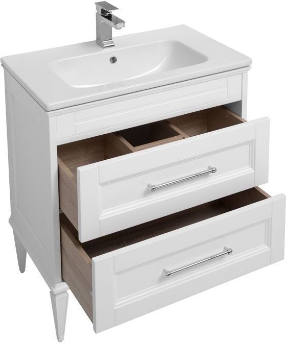 Тумба Aquanet Бостон М 80 белого цвета интересна внешне. Фрезеровка по белоснежным матовым фасадам и по боковым ее частям придает внешнему виду изделия шириной 80 см достойный и благородный вид, свойственный классике. Но утонченные ручки производства известной турецкой фирмы System, словно ниточки поблескивающие на фасадах, визуальная легкость изделия напоминает о модерне. Тумба с двумя выдвижными ящиками, оборудованными доводчиками производства компании Hettich, вмещает огромное количество полезных вещей. В верхнем ящике предусмотрено три отделения, что делает его пространство более удобным для использования: все вещи будут на своих местах. Нижний ящик просторный и в него можно поставить многочисленные шампуни, гели, муссы, маски, кремы и другие емкости. Тумба комплектуется качественной керамической раковиной «Эйфория», изготовленной по чешской шамотной технологии компанией Dreja. Модель имеет два варианта монтажа. Базовый – подвесной. Кроме того, специально для этой коллекции были разработаны очень элегантные ножки, выполненные из массива и окрашенные в белый цвет. С такими ножками тумба приобретает благородный вид и еще больше тяготеет по своему стилю к классике.