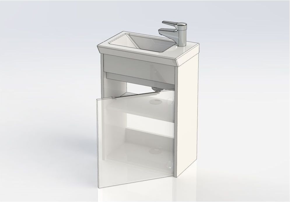 В тумбе предусмотрены просторные полки, а столешницей служит глубокая прямоугольная керамическая раковина. Отверстие под смеситель для удобства расположен по правую руку. <