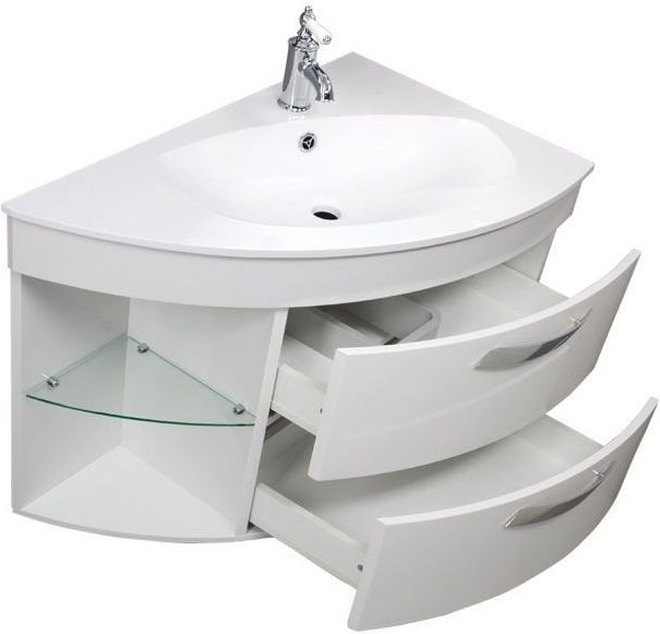 Тумба в ванную комнату De Aqua Трио Люкс 80 R (цвет -белый, фурнитура - хром) словно скользнувшая по стене и застывшая на ней волна, сглаживает угол помещения ванной комнаты, извлекая из него максимум функциональных возможностей. Фигурные ящички, выкатывающиеся на доводчиках, способны скрыть все необходимые в ванной комнаты умывальные принадлежности. Раковина создана специально для этой коллекции и идеально вписывается в антураж.