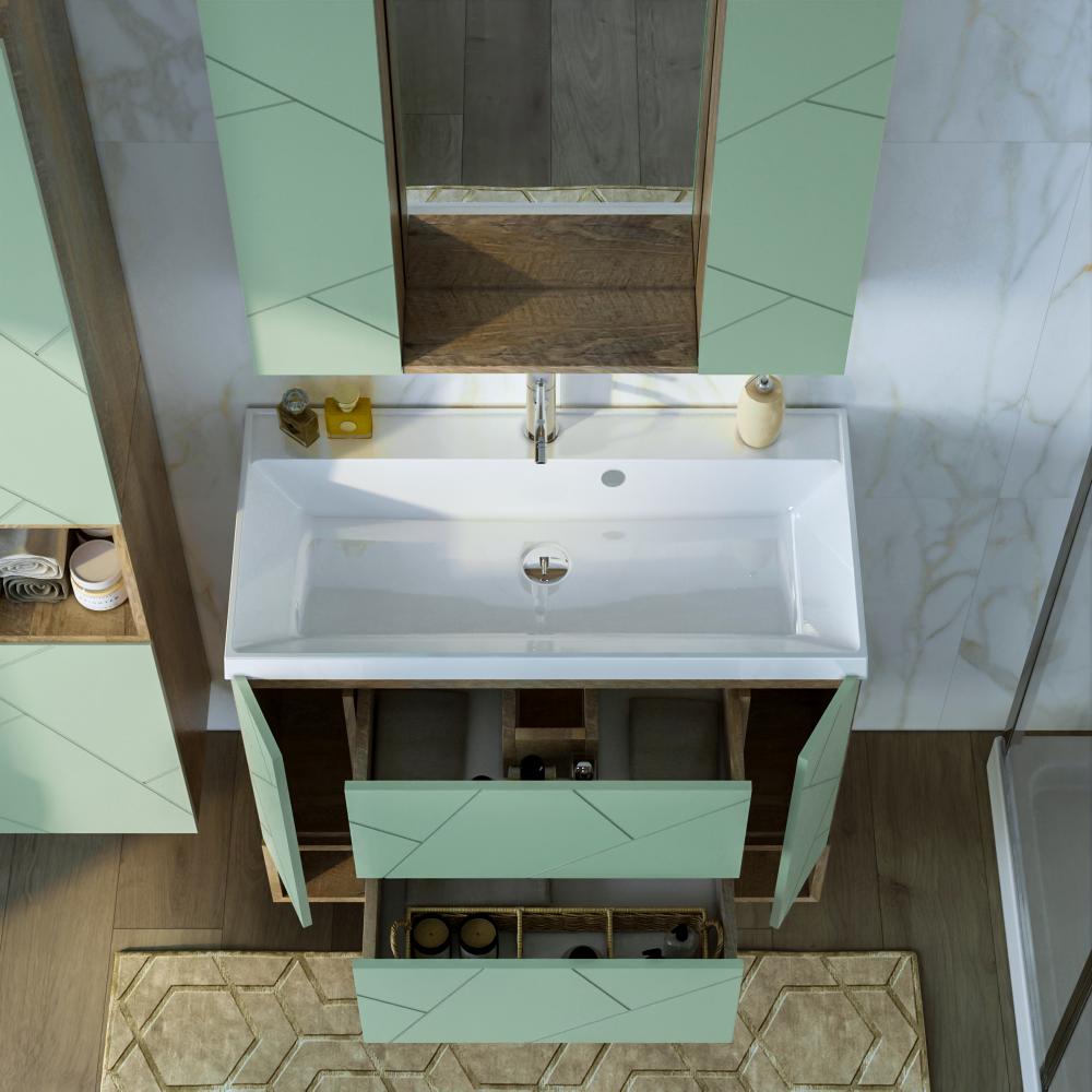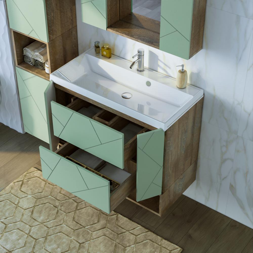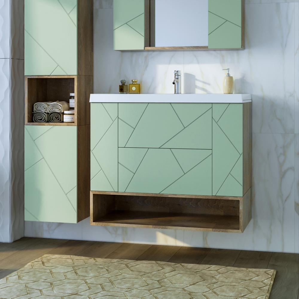 Комплект мебели Бриклаер КРИСТАЛЛ состоит из: Тумба под раковину подвесная Бриклаер КРИСТАЛЛ фисташковый, 90 см, Раковина Paola Alba 900, белый, Ниша для тумбы Бриклаер КРИСТАЛЛ 90 см, дуб гранж песочный, .