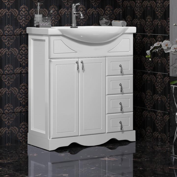 Коллекция мебели для ванной комнаты КЛИО представляет собой великолепную комбинацию из различных вариантов компактной мебели 65, 75 и 85 см. Комплект 65 см состоит из двух распашных дверец и нижнего выдвижного ящика. Комплекты 75 и 85 см состоят из двух распашных дверец (в левой части тумбы) и четырех выдвижных ящиков в правой части тумбы. Мебель из коллекции КЛИО комплектуется керамической раковиной.