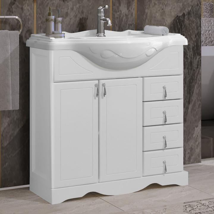 Коллекция мебели для ванной комнаты КЛИО представляет собой великолепную комбинацию из различных вариантов компактной мебели 65, 75 и 85 см. Комплект 65 см состоит из двух распашных дверец и нижнего выдвижного ящика. Комплекты 75 и 85 см состоят из двух распашных дверец (в левой части тумбы) и четырех выдвижных ящиков в правой части тумбы. Мебель из коллекции КЛИО комплектуется керамической раковиной.