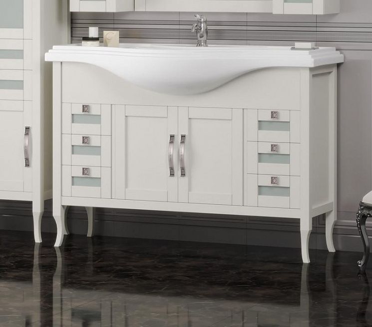Модельный ряд коллекции МИРАЖ выполнен в двух вариантах — 100 см и 120 см, а также снабжен оригинальными дополнительными решениями для хранения: напольные комод, одностворчатый и двустворчатый пеналы, зеркала с дополнительными навесными шкафами.