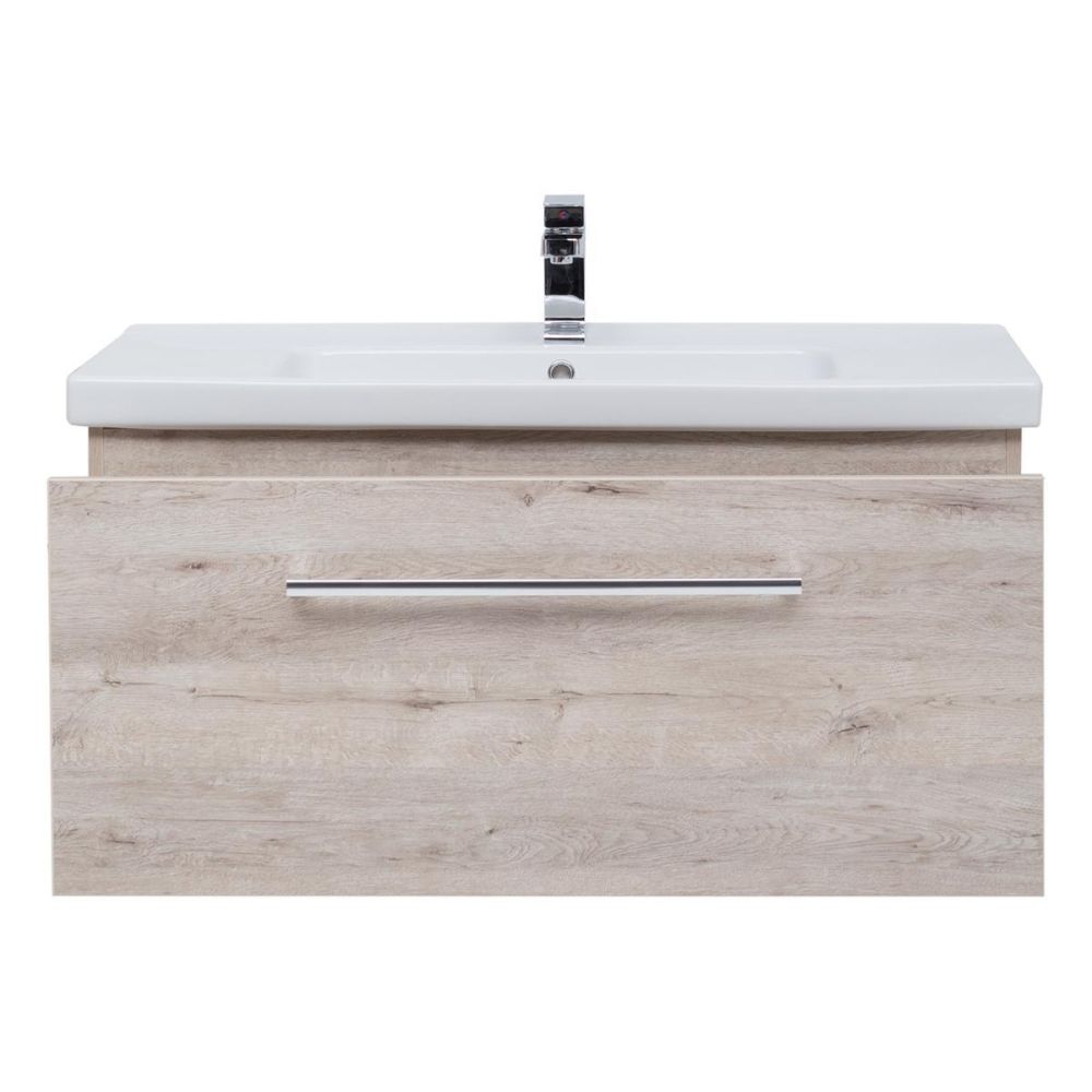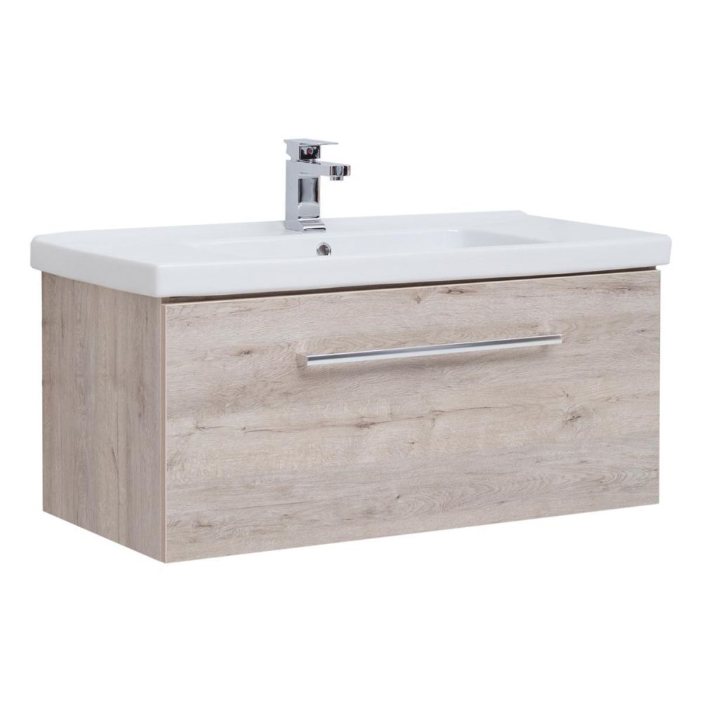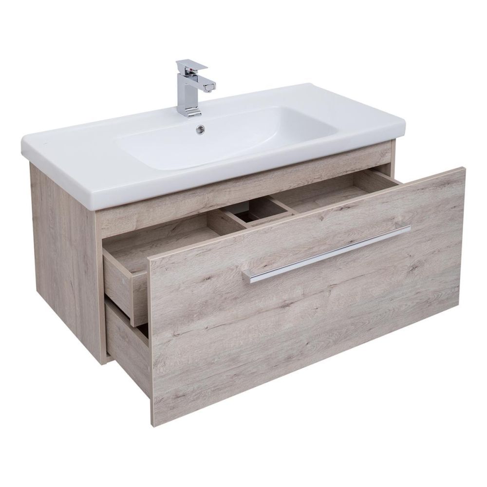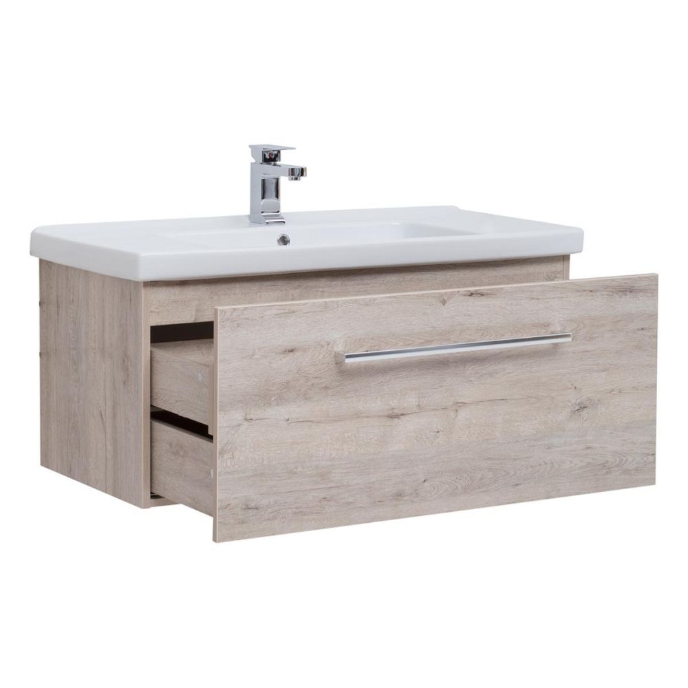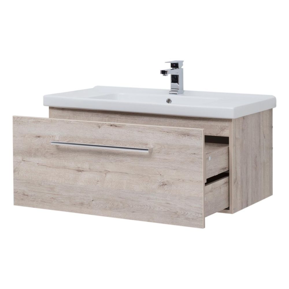 Тумба под раковину подвесная Dreja Big Inn 80 см, дуб кантри. Фурнитура: Hettich. Компоновка: 1 ящик + выдвижной внутренний ящик. Дополнительные функции: встроенный органайзер в верхнем ящике. Монтаж: подвесной. Раковина арт.: 640207 в комплекте.