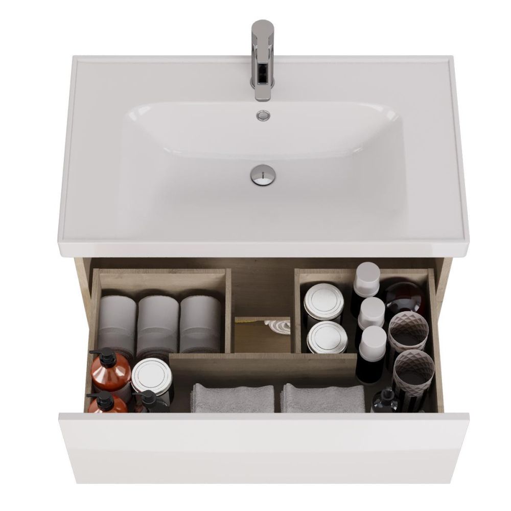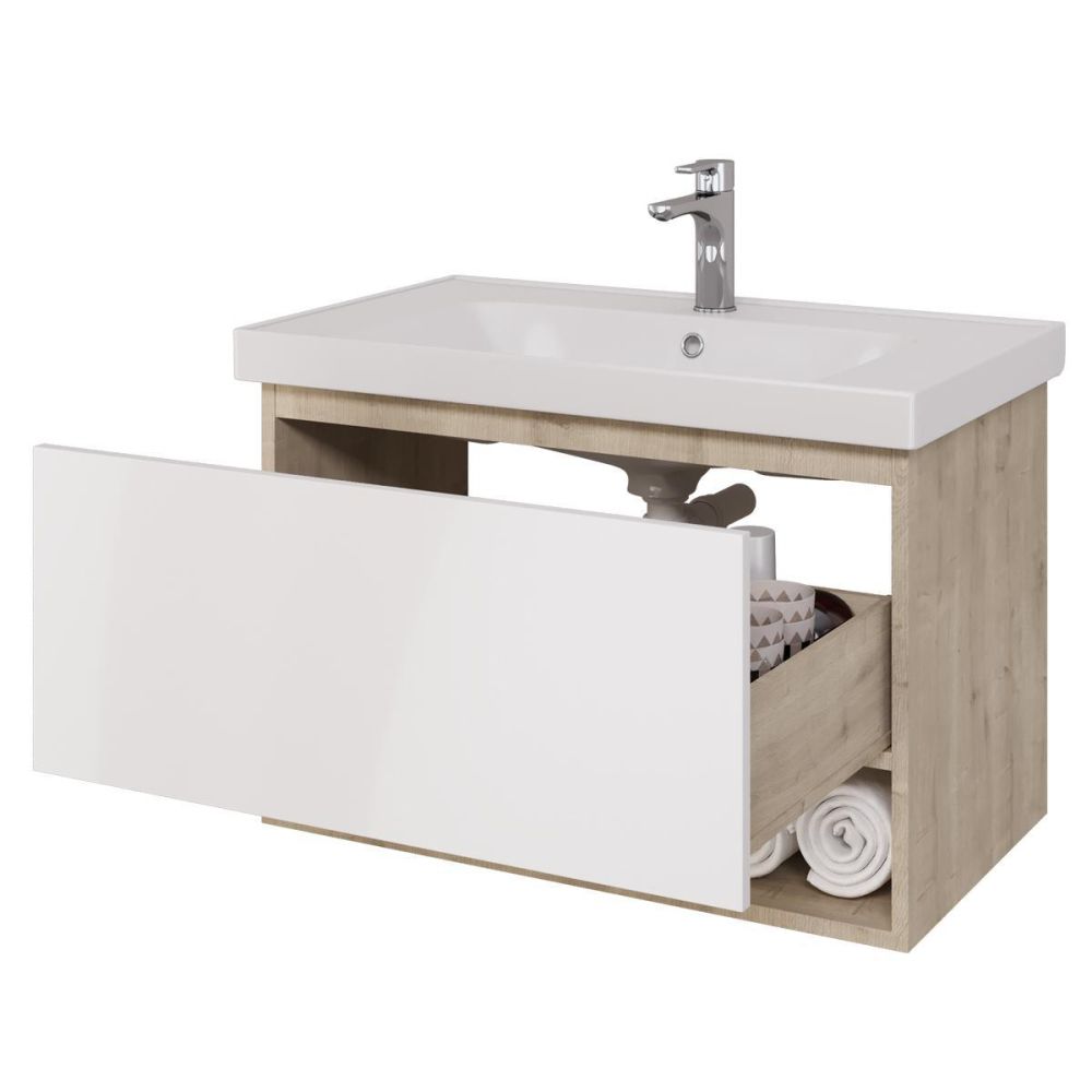 Тумба под раковину подвесная Dreja Perfecto 90 см, дуб эврика/белый. Фурнитура: Hettich. Компоновка: 1 ящик. Дополнительные функции: встроенный органайзер. Монтаж: подвесной. Раковина арт.: 641617 в комплекте.